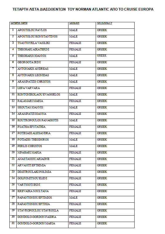 Η τέταρτη λίστα των διασωθέντων επιβατών από το «CRUISE EUROPA»: