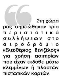 Στη χώρα μας σημειώθηκαν τρία περιστατικά συλλήψεων στο αεροδρόμιο “Ελευθέριος Βενιζέλος” για χρήση εισιτηρίων που είχαν εκδοθεί μέσω κλεμμένων ή πλαστών πιστωτικών καρτών).