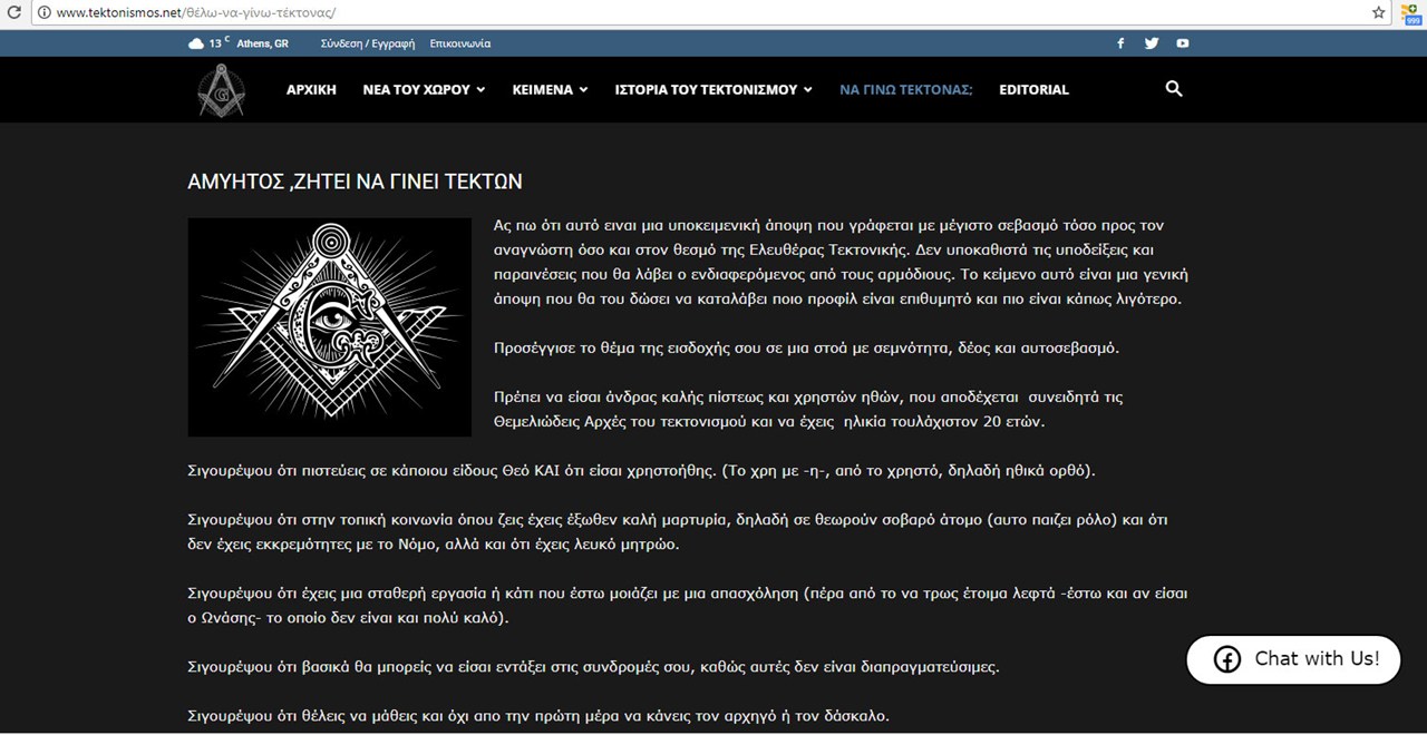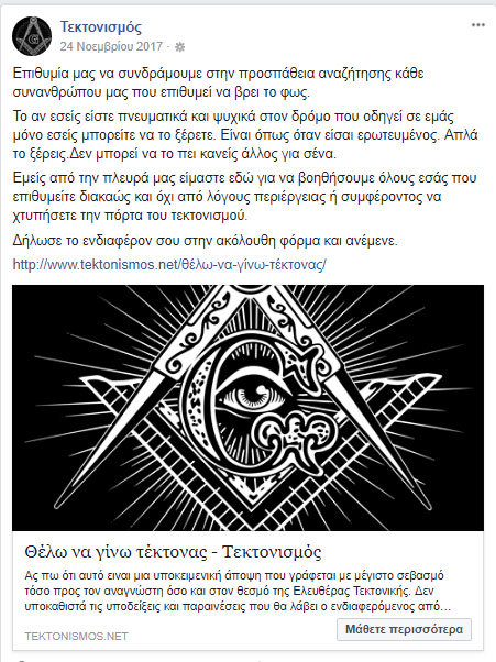 Αυτό αναφέρει μεταξύ πολλών άλλων η «αγγελία» ανεύρεσης μελών, που έχει αναρτηθεί στην σελίδα του facebook με όνομα «Τεκτονισμός».