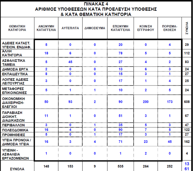 Τα περισσότερα περιστατικά διαφθοράς σχετίζονται με παραβάσεις καθήκοντος, συναλλαγές δημόσιων λειτουργών κάτω από το τραπέζι και ελλιπή ή αδικαιολόγητα «πόθεν έσχες».