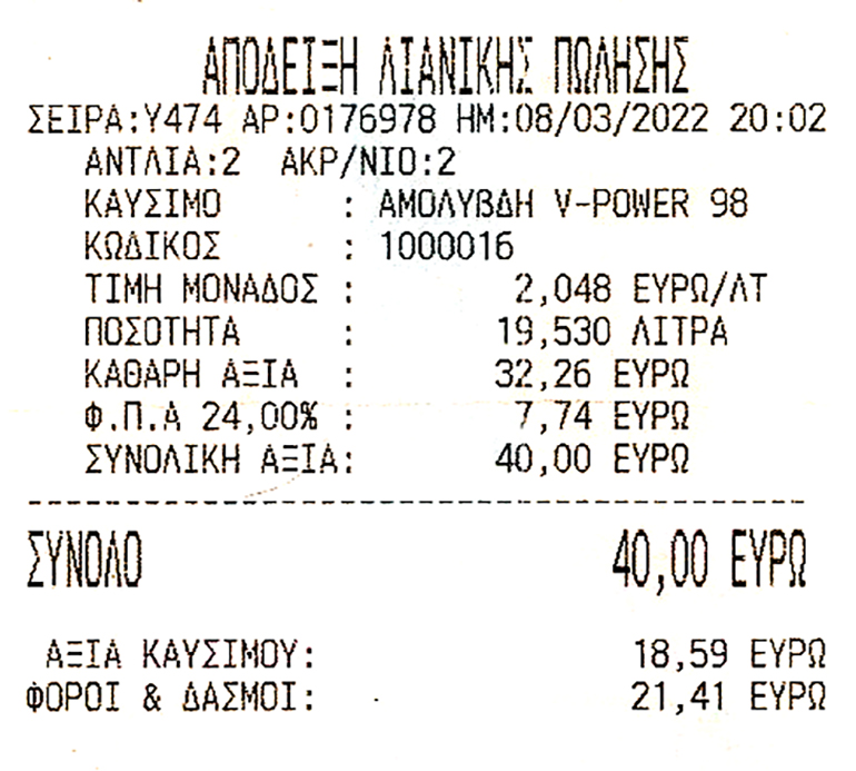 Δείτε παρακάτω μια απόδειξη με την οποία αποδεικνύεται ότι ο καταναλωτής έβαλε βενζίνη αξίας 18,59 ευρώ και πλήρωσε 40 ευρώ για να καταλάβετε πόσο βαθιά μπαίνει στην τσέπη του το βαθύ χέρι του ελληνικού κράτους και της Ευρωπαϊκής Ένωσης, η οποία επέβαλε μέσω των μνημονίων αυτούς τους επαχθείς φόρους.