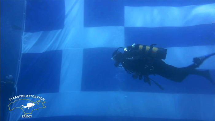 Υπό ιδανικές καιρικές συνθήκες, στα καταγάλανα νερά του κολπίσκου της Αγίας Παρασκευής της Σάμου, 19 δύτες άπλωσαν υποβρυχίως Ελληνική σημαία 70 τετραγωνικών μέτρων (7μ x 10μ), τη μεγαλύτερη γαλανόλευκη που έχει απλωθεί ποτέ κάτω από την επιφάνεια της θάλασσας.