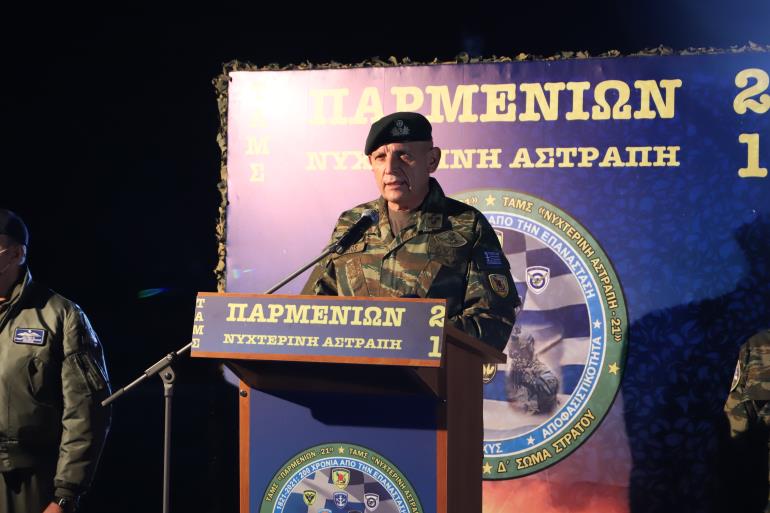 Στον χαιρετισμό που απηύθυνε ο Αρχηγός ΓΕΕΘΑ μετά την ολοκλήρωση της ΤΑΜΣ «ΝΥΧΤΕΡΙΝΗ ΑΣΤΡΑΠΗ-21», εξήρε την υψηλή επιχειρησιακή ετοιμότητα του προσωπικού και των μέσων που συμμετείχαν στην άσκηση, καθώς και την άριστη διακλαδική συνεργασία επί του πεδίου σε μια υψηλών απαιτήσεων συνέργεια νυκτερινού αγώνα.