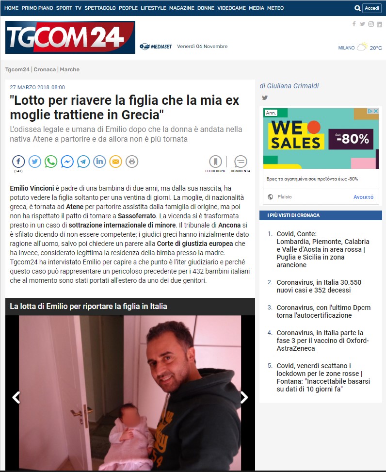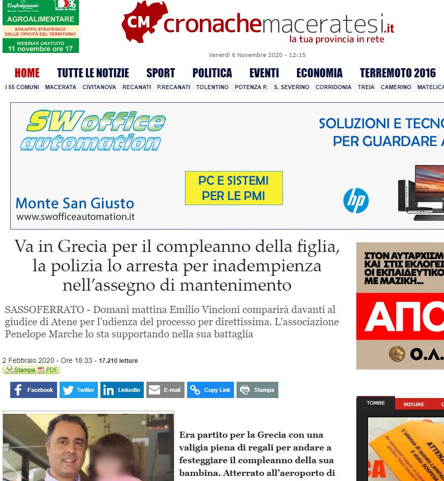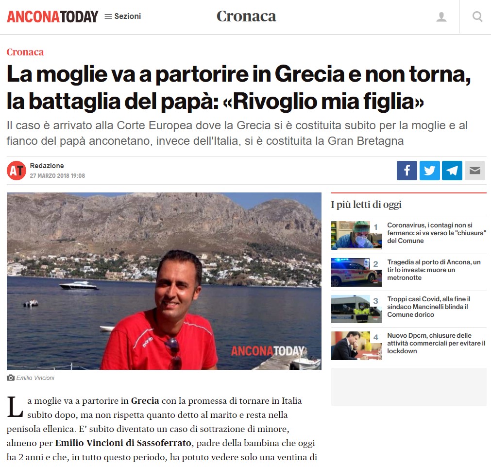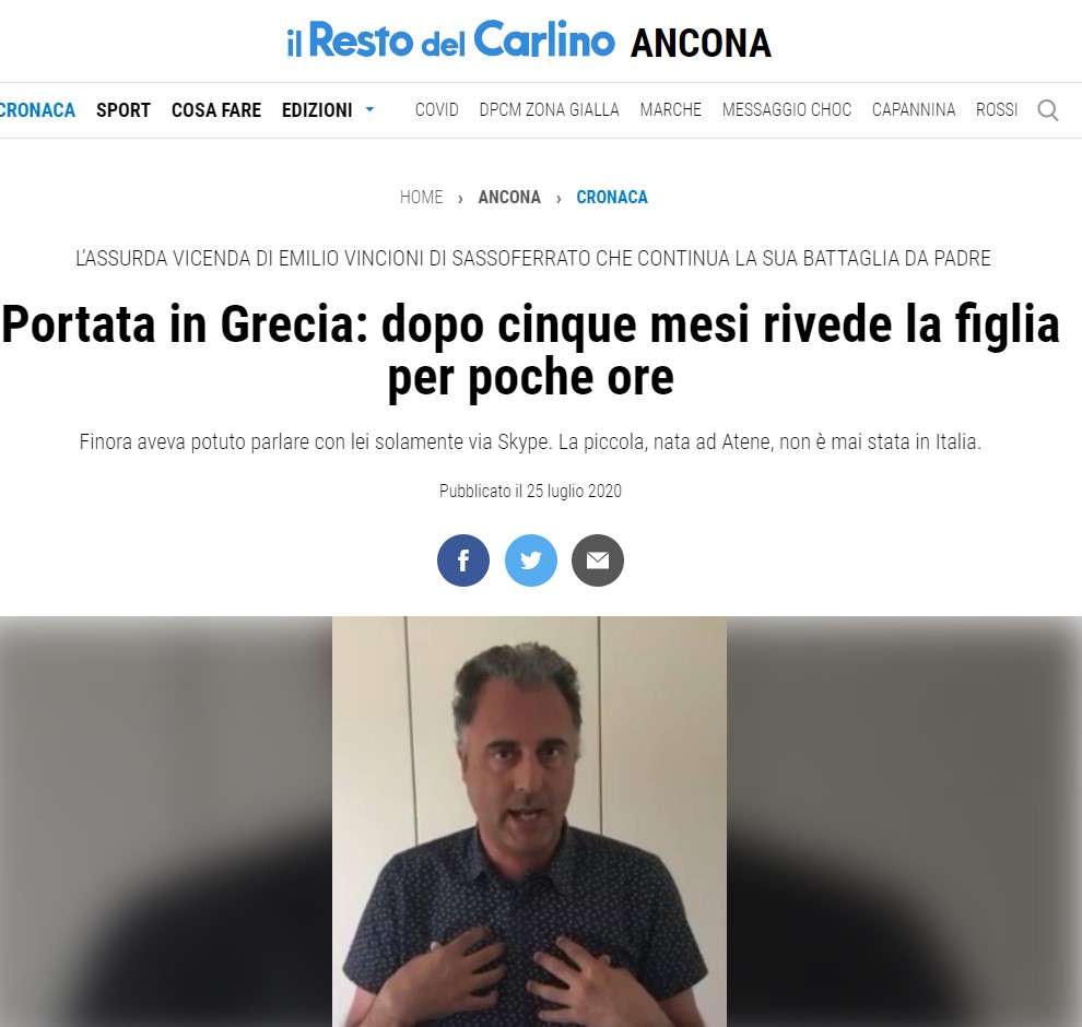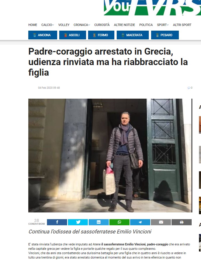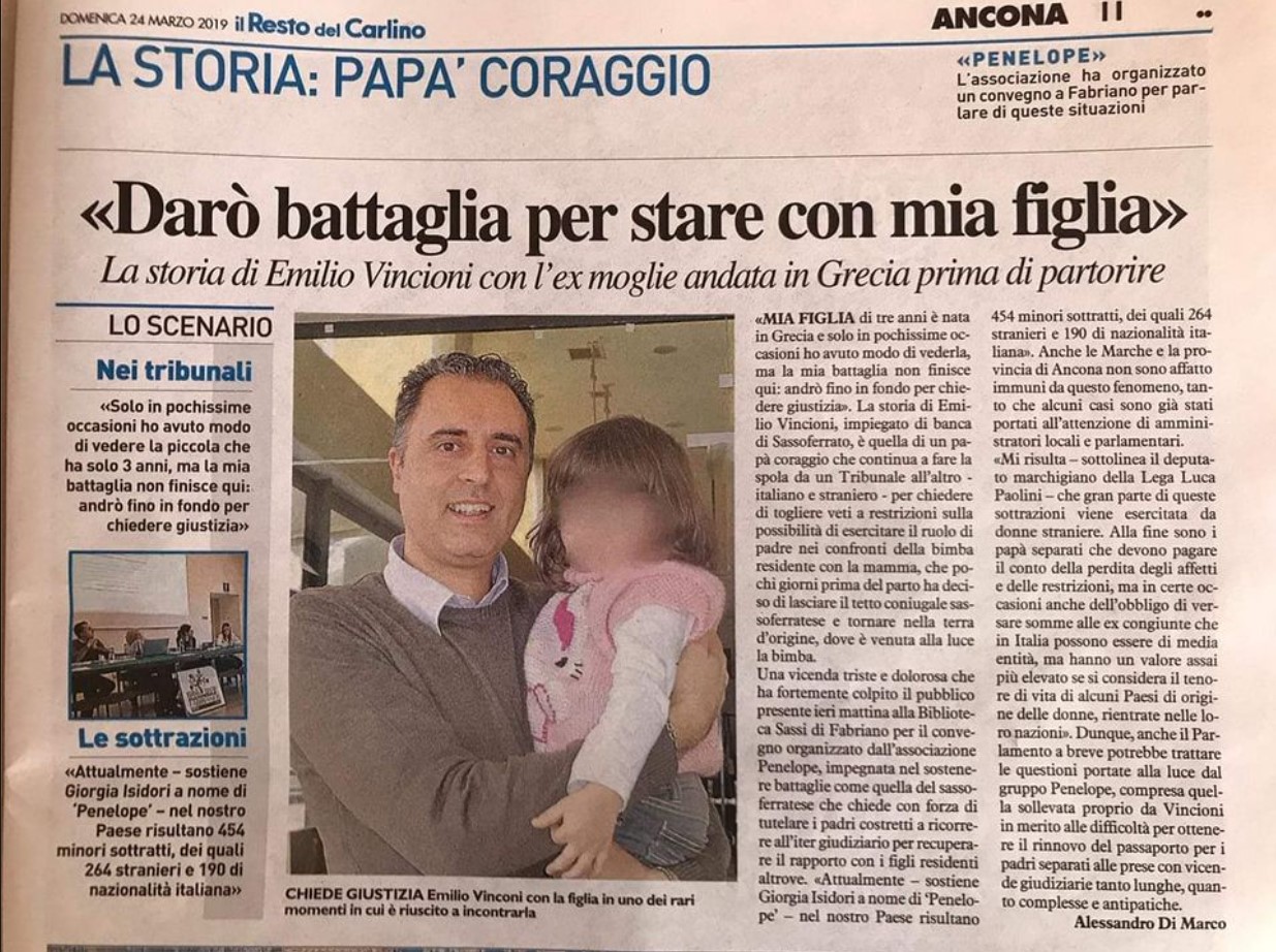 Η περιπέτεια του Εμίλιο για τους Ιταλούς λίγο πολύ είναι γνωστή από δημοσιεύματα. Άλλωστε δεν είναι ο μοναδικός πατέρας που βρέθηκε σε αυτή τη θέση. Δεκάδες δικαστήρια για να μπορέσει να κερδίσει τη συνεπιμέλεια αλλά μάταια. Ακόμα και τα Ευρωπαϊκά Δικαστήρια όπου προσέφυγε δεν τον δικαίωσαν, αλλά ούτε και τα Ιταλικά. Απευθύνθηκε ακόμα και σε Ιταλούς πολιτικούς, προκειμένου να παρέμβουν για την υπόθεσή του.  Όπως εξηγεί στο zougla.gr «μου πήραν το παιδί μου. Δεν μπορώ ως πατέρας να μεγαλώσω την κόρη μου που σήμερα είναι 4,5 ετών. Για να δω την κόρη μου πρέπει να ταξιδεύω στην Ελλάδα και ο χρόνος μαζί της είναι περιορισμένος. Τα ελληνικά δικαστήρια μου απαγορεύουν βάσει νόμου να μπορώ κι εγώ να μεγαλώνω την κόρη μου. Μπορεί η μητέρα της να μην θέλει να γυρίσει στην Ιταλία αλλά είναι και δικό μου παιδί. Τον Φεβρουάριο με συνέλαβαν στο αεροδρόμιο επειδή αντί για 550 ευρώ διατροφή είχα βάλει 400. Είχε τα γενέθλιά της η κόρη μου και ήρθα στην Ελλάδα με δώρα για να της δώσω. Με σταμάτησαν και με συνέλαβαν».