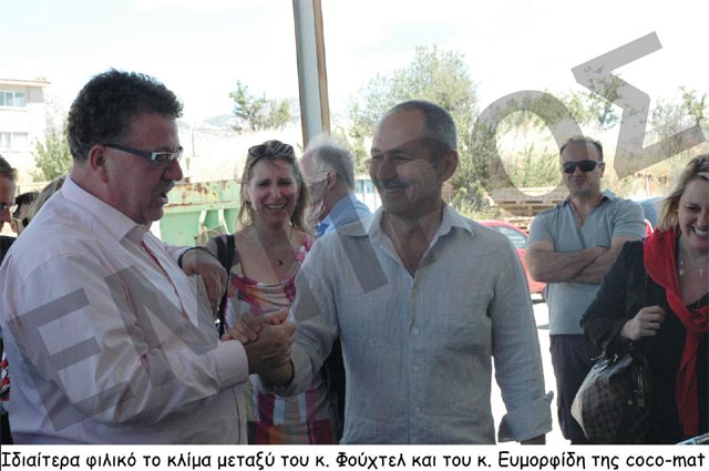 «Ευπρόσδεκτοι είναι οι άνθρωποι! Ήρθαν να μας δουν γιατί έχουμε μαγαζιά στην Γερμανία…», δήλωσε στο «Ε» για το σκοπό την επίσκεψης του κ. Φούχτελ ο επιχειρηματίας κ. Παύλος Ευμορφίδης, δίνοντας παράλληλα συμβουλές για την αντιμετώπιση της κρίσης που όπως είπε την Coco-Mat δεν την αγγίζει: «Εμείς αγγίζουμε την κρίση όχι η κρίση εμάς… Πρέπει να παράγουμε και να μονοιάσουμε οι έλληνες… δεν είναι ωραίο πράγμα να τρωγόμαστε»!