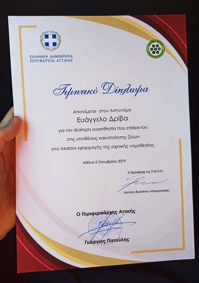 Η Πανελλαδική Φιλοζωική Περιβαλλοντική Ομοσπονδία βράβευσε στις 23 Νοεμβρίου αστυνομικούς από όλη τη χώρα που έχουν χειριστεί με ενσυναίσθηση και ευαισθησία τα καθήκοντά τους όσον αφορά στα περιστατικά κακοποίησης ζώων.