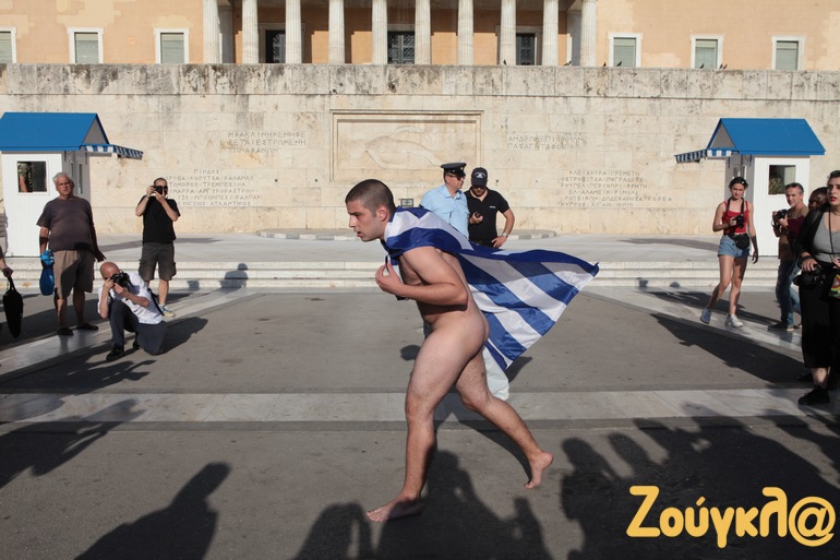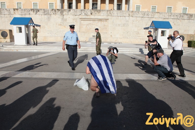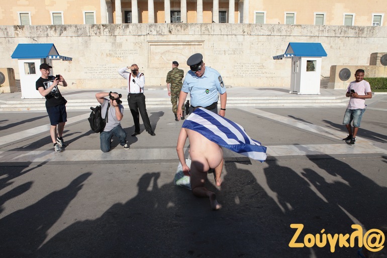 Ένας γυμνός διαδηλωτής, φέροντας την ελληνική σημαία, πλησίασε το Μνημείο του Αγνώστου Στρατιώτη: