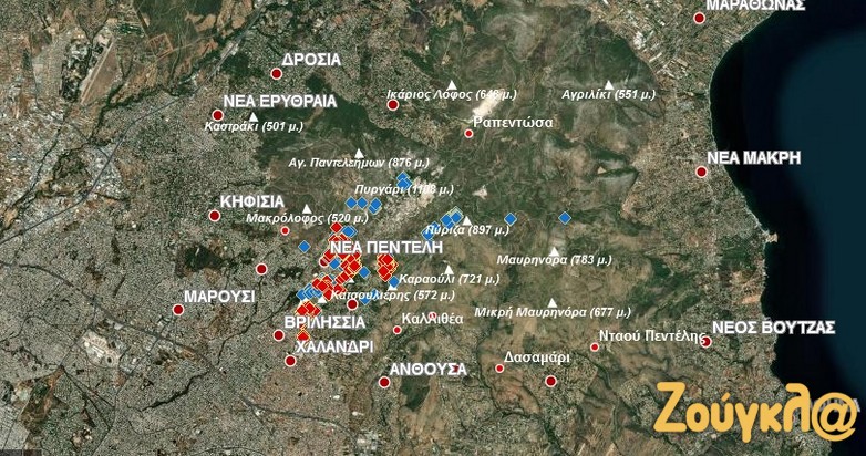 Ο Νέστορας Ζύγρας είναι αγρονόμος, τοπογράφος μηχανικός και πρόεδρος του περιβαλλοντικού συλλόγου «Η Πεντέλη μας». Στην ιστοσελίδα του συλλόγου υπάρχει ένας διαδραστικός χάρτης αναφορών, όπου κάτοικοι και εθελοντές μπορούν να αναρτούν καταγγελίες συμβάντων με δυσμενείς επιπτώσεις για το περιβάλλον του βουνού. Όπως βλέπετε στην παρακάτω φωτογραφία, οι καταγγελίες είναι δεκάδες και επικεντρώνονται κυρίως στα ρέματα Πεντέλης -Χαλανδρίου, Αγίου Σίλα, Βριλησσού, Παλαιάς Πεντέλης και Βαθυρέματος.