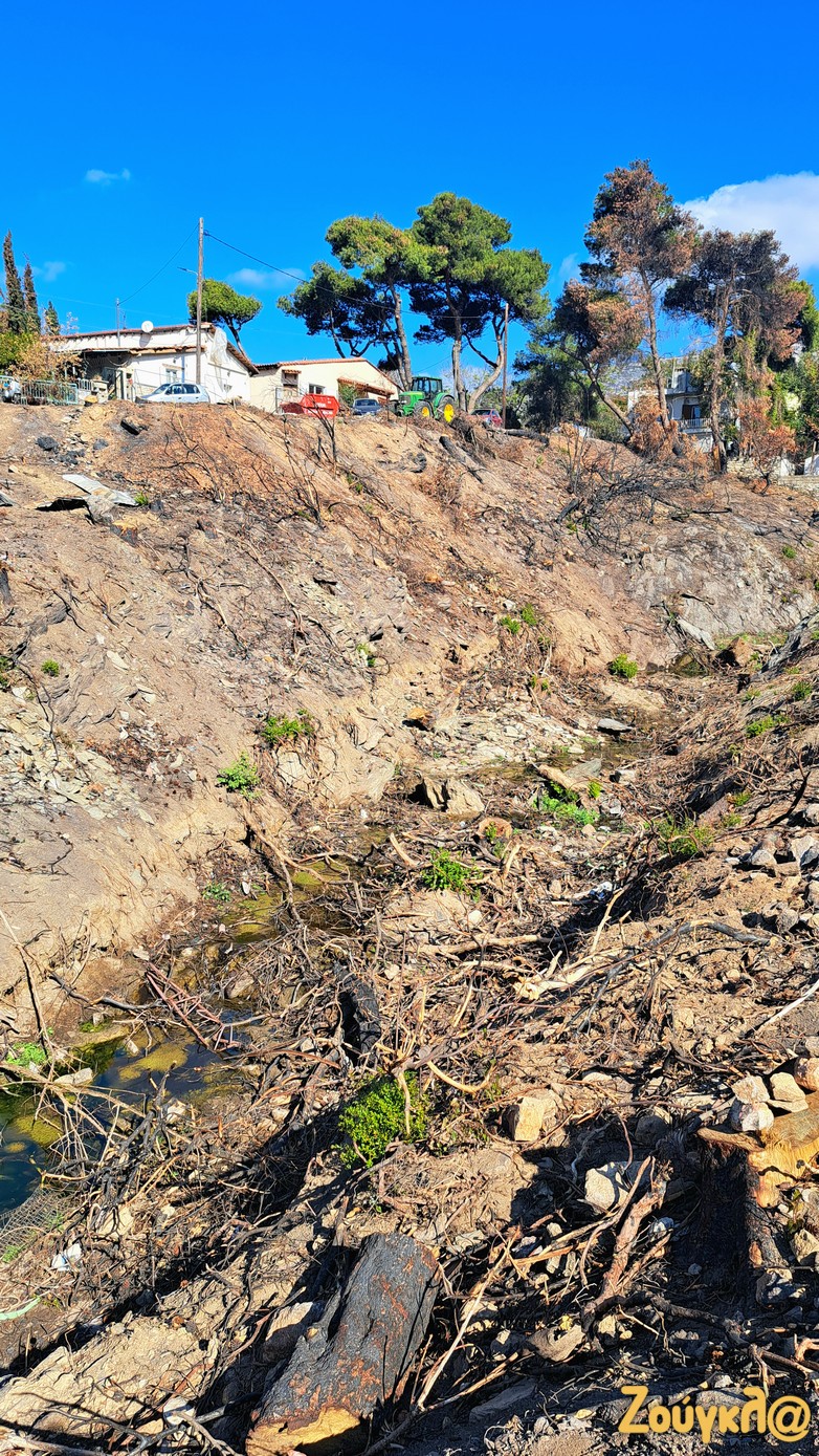 Κομμένοι κορμοί και κλαδιά από τις εργασίες των συνεργείων, μέσα στο ρέμα Πεντέλης – Χαλανδρίου