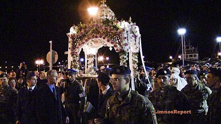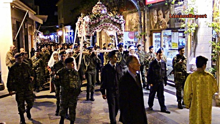 Στη Μύρινα στο κέντρο του νησιού, το παρόν έδωσε ολόκληρη η πολιτική και στρατιωτική ηγεσία. Μοναδικό ήταν θέαμα των δύο επιταφίων να κινούνται παράλληλα μπροστά από το Δημαρχείο στο παλιό λιμάνι της Μύρινας.