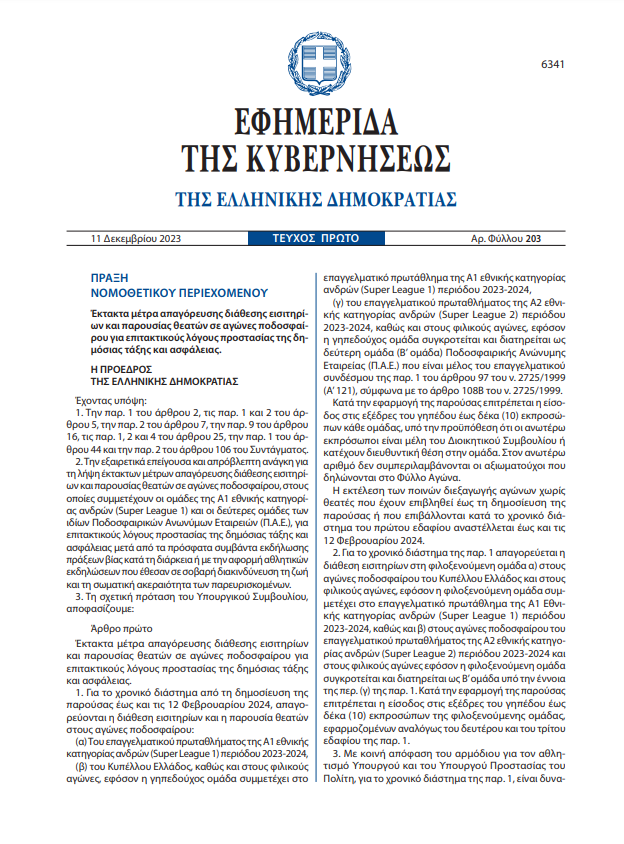 Δημοσιεύτηκε σήμερα, Τετάρτη 13 Δεκεμβρίου, η Πράξη Νομοθετικού Περιεχομένου για τους αγώνες κεκλεισμένων των θυρών, που αποφάσισε η κυβέρνηση, μετά τα νέα επεισόδια οπαδικής βίας στην Ελλάδα με θύμα τον 31 ετών αστυνομικό.