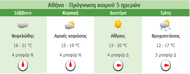 Λίγες νεφώσεις προβλέπονται, παροδικά αυξημένες το μεσημέρι και το απόγευμα, οπότε υπάρχει πιθανότητα πρόσκαιρων τοπικών βροχών. Η θερμοκρασία θα κυμανθεί από 12 έως 21 βαθμούς Κελσίου.