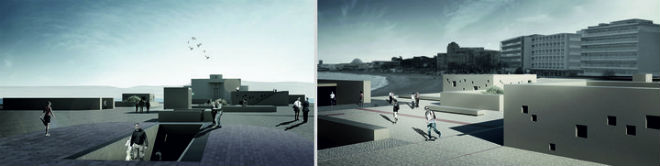 Από την άλλη, στην πλατεία Ενυδρείου, την οποία και θεωρούμε συνέχεια ή απόληξη της επανασχεδιασμένης πράσινης πλατείας, προτείνουμε τον σχεδιασμό των υπόγειων λουτρών. Μέσω της σύνθεσης, επιδιώκουμε την αρμονική συνύπαρξη μεταξύ των νέων κτιριακών όγκων, του Ενυδρείου και του φυσικού τοπίου, η οποία θα αντιτάσσεται σ’ αυτή την πολυόροφων ξενοδοχειακών εγκαταστάσεων του βόρειου τμήματος της πόλης, που υψώνονται επιβλητικά.