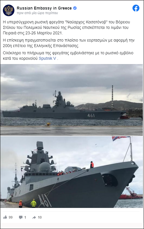 Η επίσκεψη της ρωσικής φρεγάτας στο λιμάνι του Πειραιά πραγματοποιείται στο πλαίσιο των εορτασμών με αφορμή την 200η επέτειο της Ελληνικής Επανάστασης.