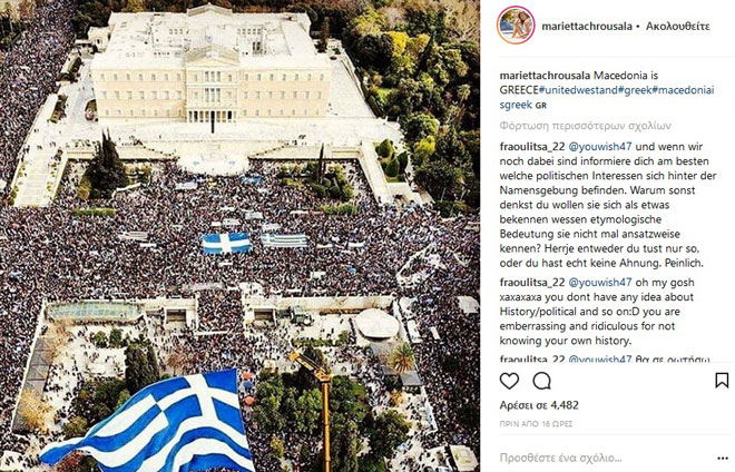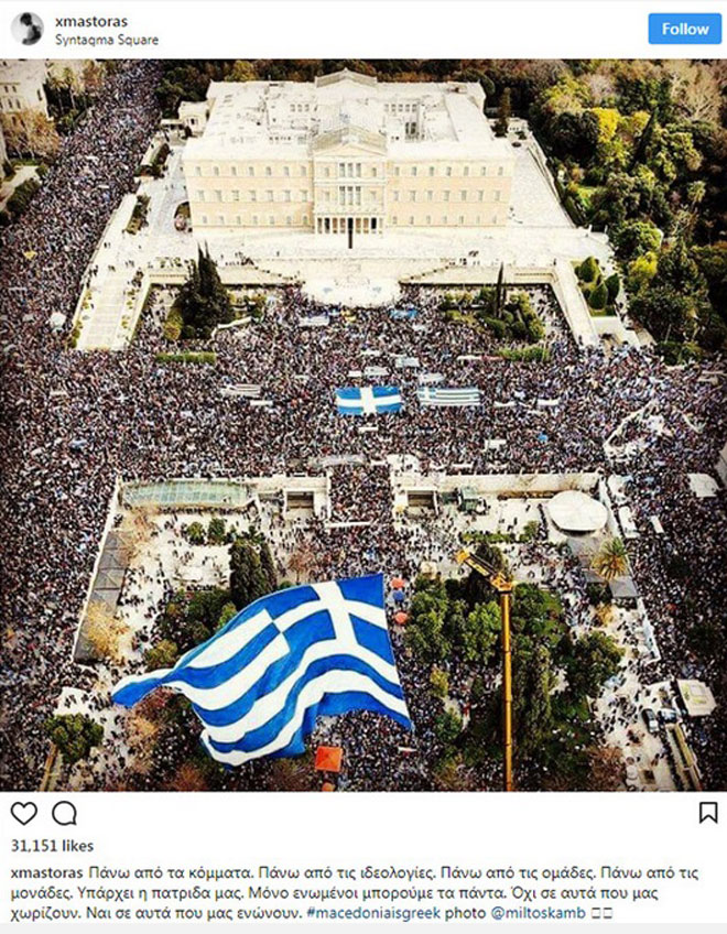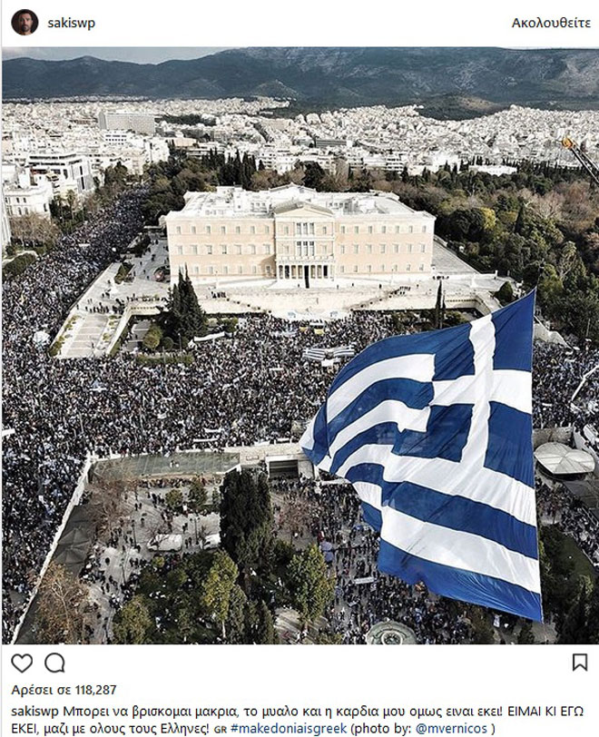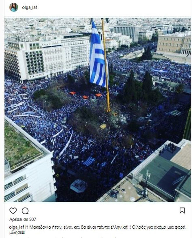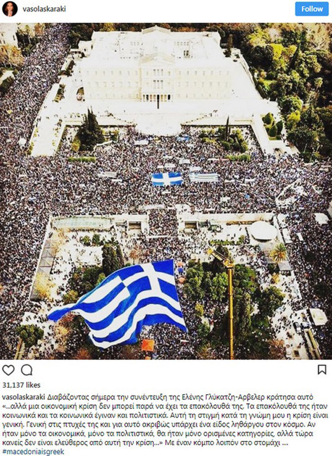 Χιλιάδες κόσμου ανάμεσά τους και άνθρωποι από τον χώρο της showbiz βρέθηκαν το μεσημέρι της Κυριακής στο κέντρο της Αθήνας για να διαδηλώσουν στο συλλαλητήριο για τη Μακεδονία. Υπήρχαν ωστόσο και επώνυμοι, οι οποίοι έκαναν σχετικές αναρτήσεις με φωτογραφίες και ηχηρά μηνύματα διαμαρτυρίας μέσα από τα μέσα κοινωνικής δικτύωσης.