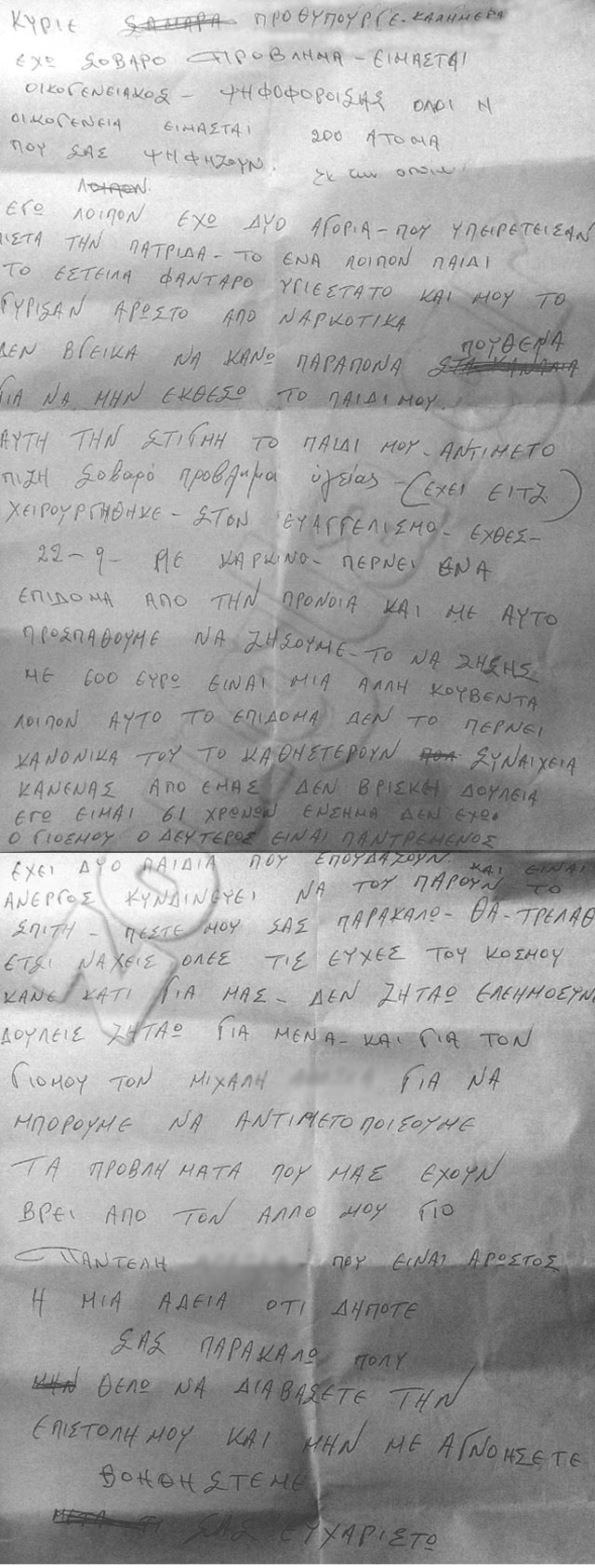 Η πονεμένη μάνα δεν ζητεί ελεημοσύνη. Μάλιστα, απέστειλε επιστολή στον πρωθυπουργό, δίχως φυσικά να πάρει απάντηση, αναφέροντας ότι όλη η οικογένεια ζει με τα 600 ευρώ που λαμβάνει ως επίδομα πρόνοιας. Τις περισσότερες φορές, αργεί η καταβολή του ποσού με αποτέλεσμα τα χρέη να συσσωρεύονται.