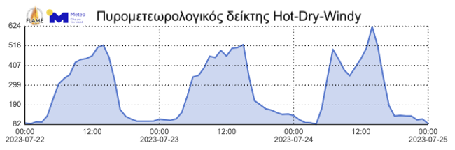 Τέλος, με βάση τα πιο πρόσφατα προγνωστικά στοιχεία της Πυρομετεωρολογικής Ομάδας FLAME του ΜΕΤΕΟ/ΕΑΑ (Εικόνες 3, 4), αναμένεται πρόσκαιρη και μερική βελτίωση των πυρομετεωρολογικών συνθηκών λόγω της σχετικής εξασθένησης των ανέμων. Θα πρέπει ωστόσο να σημειωθεί πως η ευφλεκτότητα των νεκρών δασικών καυσίμων θα παραμείνει ιδιαίτερα υψηλή και κατά τη διάρκεια των νυχτερινών ωρών (τιμές περιεχόμενης υγρασίας κάτω του 9-10%), γεγονός που αναμένεται να δυσχεράνει τον έλεγχο της φωτιάς. Σημαντικό είναι να τονιστεί ότι από τις πρώτες πρωινές ώρες εώς τις μεσημβρινές ώρες της Κυριακής 23.07.2023, στο δυτικό μέτωπο της πυρκαγιάς αναμένεται πρόσκαιρη μεταβολή της διεύθυνσης του ανέμου σε Β/ΒΑ, ενώ μετά τις μεσημβρινές ώρες αναμένουμε εκ νέου στροφή των ανέμων σε Β/ΒΔ διευθύνσεις. Οι πλέον δυσμενείς πυρομετεωρολογικές συνθήκες αναμένονται κατά τις θερμές ώρες (11:00 – 18:00) της Κυριακής 23.07.2023, οπότε και η ένταση των ανέμων θα αυξηθεί με την ευφλεκτότητα να είναι εξαιρετικά υψηλή (τιμές περιεχόμενης υγρασίας κάτω του 7%).