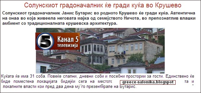 Δύο εβδομάδες, μετά το δημοσίευμα του σκοπιανού δικτύου «kanal 5», ότι ο δήμαρχος Θεσσαλονίκης Γ. Μπουτάρης ζήτησε και πήρε άδεια από το συμβούλιο της πόλης Κρούσεβο, στην νότια ΠΓΔΜ για ανέγερση κτιρίου 30 δωματίων το οποίο θα χρησιμοποιηθεί ως μουσείο αλλά και ως κατοικία, ο δήμος Θεσσαλονίκης, ανακοινώνει και επισήμως, συνεργασία με το Κρούσεβο για αξιοποίηση παραδοσιακών κτηρίων. Πιο συγκεκριμένα, ο δήμος Κρούσεβο προτείνει την ανακαίνιση και επανακατασκευή (σε μικρή κλίμακα) του πατρικού σπιτιού του βλαχικής καταγωγής, δημάρχου Θεσσαλονίκης Γιάννη Μπουτάρη και στη συνέχεια τη λειτουργία του ως πολιτιστικού χώρου για νέους και για τη συνεργασία ανάμεσα στις δύο χώρες. Το συγκεκριμένο οίκημα αποτελεί παραδοσιακό αρχοντικό βαλκανικής αρχιτεκτονικής και ο δήμος Κρούσεβο έχει ετοιμάσει σχετική μελέτη για την αξιοποίησή του στο πλαίσιο του προγράμματος ΙNTERREG.