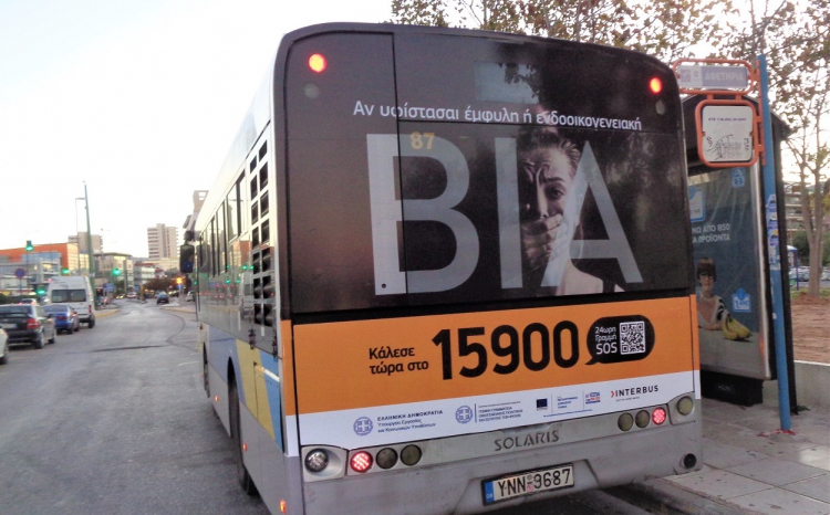 «Αν υφίστασαι έμφυλη ή ενδοοικογενειακή βία, κάλεσε τώρα στο 15900» είναι το μήνυμα της καμπάνιας που υπάρχει στο πίσω μέρος των λεωφορείων και στο πλαϊνό μέρος των τρόλεϊ. Η αφίσα έχει χρώμα πορτοκαλί, χρώμα σύμβολο στον αγώνα για την εξάλειψη της βίας κατά των γυναικών παγκοσμίως.