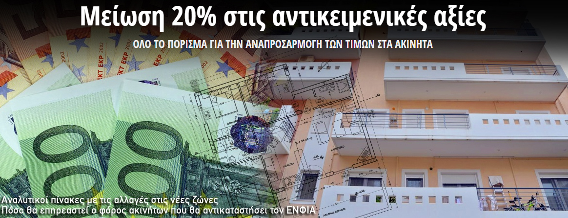 Έντονες αντιδράσεις προβλέπονται από κύκλους της αγοράς στο σχέδιο του Υπουργείου Οικονομικών για μείωση κατά 20% των αντικειμενικών αξιών και μετακύλιση της διαφοράς που προκύπτει στα δημόσια έσοδα από τον ΕΝΦΙΑ (500-600 εκατ. ευρώ) στους κατόχους μεσαίας και μεγάλης ακίνητης περιουσίας.