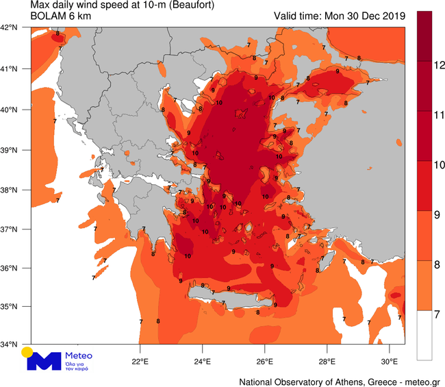 Παράλληλα πολύ θυελλώδεις άνεμοι βορείων διευθύνσεων θα επικρατήσουν στο Αιγαίο με τις εντάσεις τους την Κυριακή 29/12 να φτάνουν τα 9 μποφόρ και τη Δευτέρα 30/12 κατά τόπους και τα 10 μποφόρ, όπως φαίνεται στο χάρτη που ακολουθεί για τη Δευτέρα 30/12.