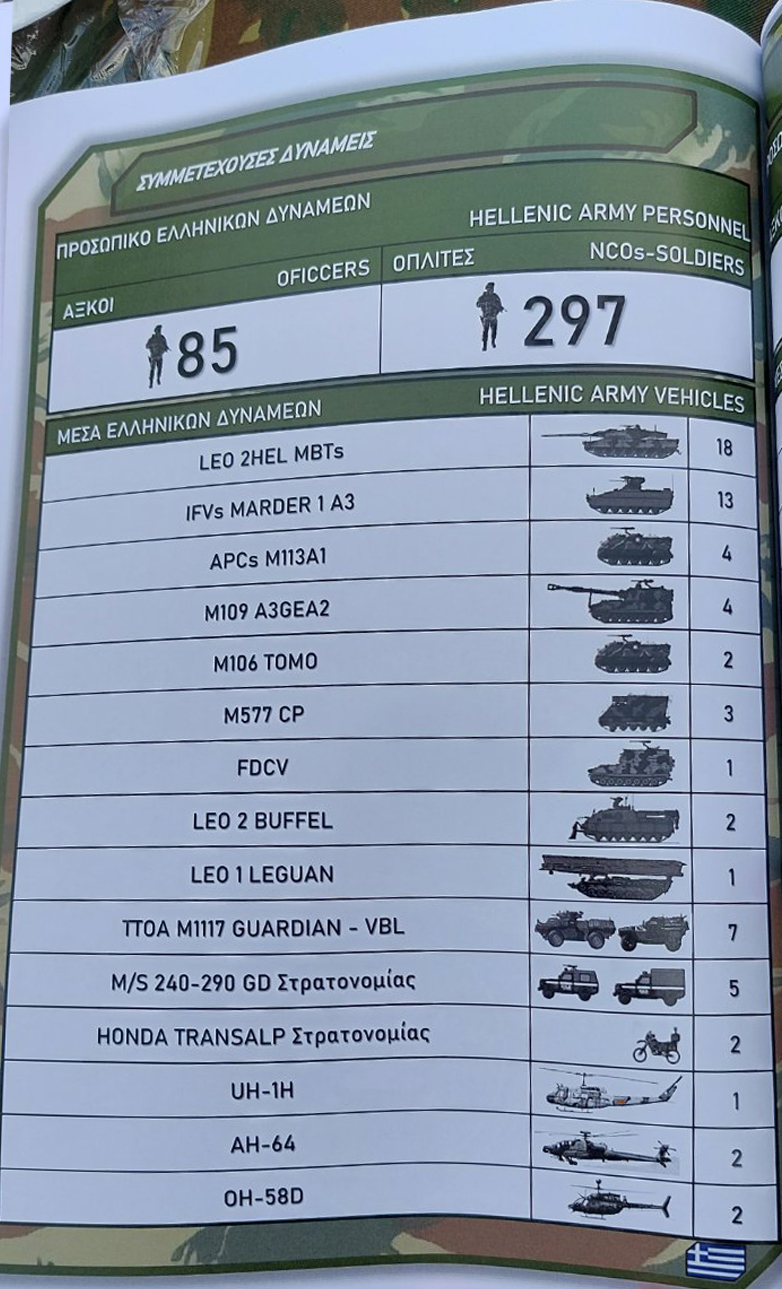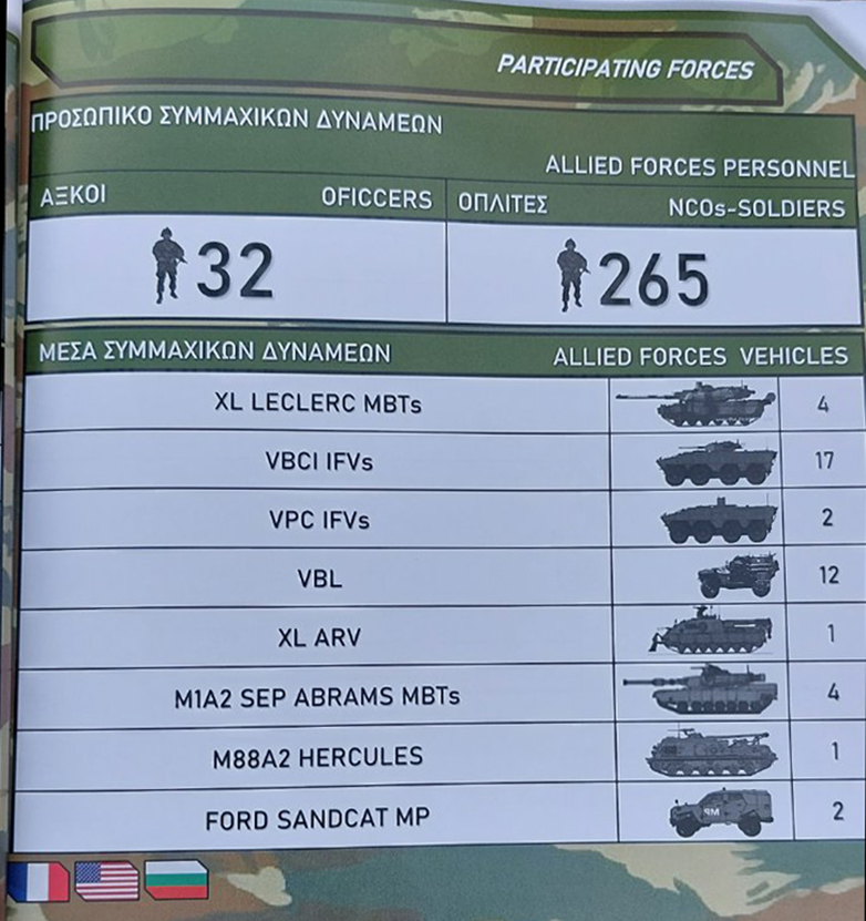 Σημειώνεται πως στην άσκηση πραγματοποιήθηκαν τις προηγούμενες ημέρες βολές αρμάτων Leopard 2HEL του Ελληνικού Στρατού, αμερικανικών M1A2 ABRAMS και για πρώτη φορά γαλλικών Leclerc.
