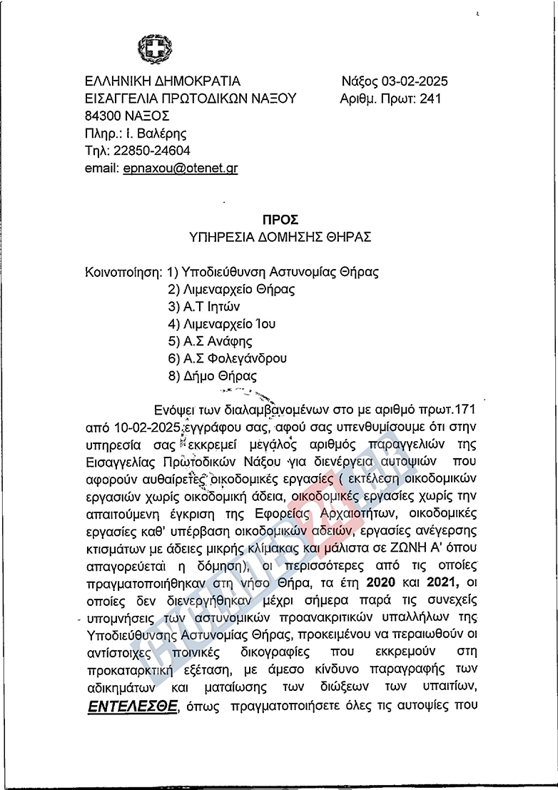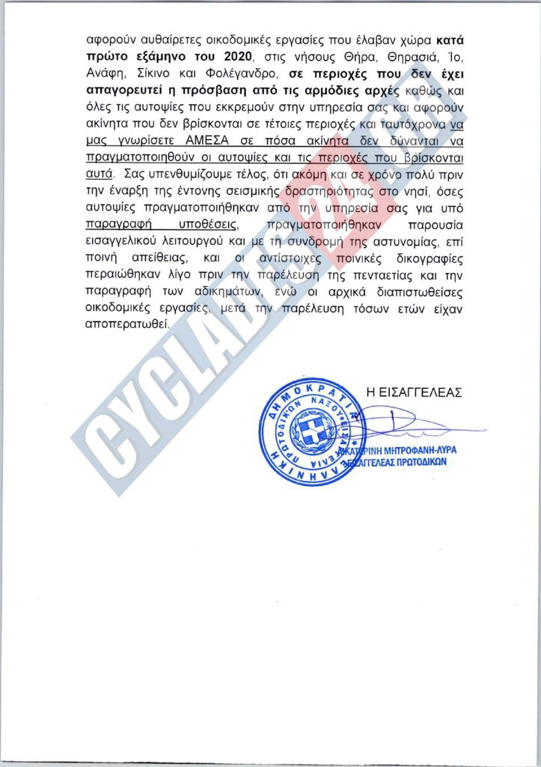 Η Υπ. Αστυνομίας Θήρας έστειλε κατεπείγον έγγραφο στην πολεοδομία Θήρας να πραγματοποιήσει αυτοψία, ωστόσο η πολεοδομία με έγγραφο που έστειλε στην εισαγγελία ενημερώνει ότι είναι επικίνδυνο να πάνε για αυτοψία και δεν θα κάνουν αυτοψίες με την εισαγγελέα να απαντά με έγγραφο στην πολεοδομία που αναφέρει ότι θα πρέπει να κάνουν τις αυτοψίες.
