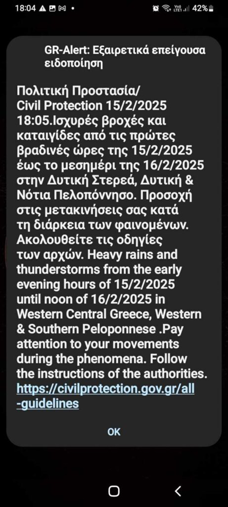Ήδη έχουν σταλεί μηνύματα από το 112 σε Λευκάδα, Κεφαλονιά, Ιθάκη, Ζάκυνθο, παράκτια Ήπειρο, Δυτική Στερεά, Δυτική και Νότια Πελοπόννησο, με τα οποία ειδοποιούνται οι πολίτες για ισχυρές βροχές και καταιγίδες από τις πρώτες βραδινές ώρες του Σαββάτου μέχρι το μεσημέρι της Κυριακής.