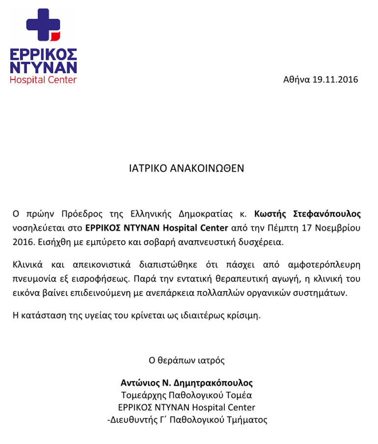 Ως ιδιαιτέρως κρίσιμη κρίνεται η κατάσταση της υγείας του πρώην Προέδρου της Δημοκρατίας Κωστή Στεφανόπουλου, ο οποίος νοσηλεύεται από την Πέμπτη, 17 Νοεμβρίου, στο Νοσοκομείο «Ερρίκος Ντυνάν», με σοβαρή λοίμωξη του αναπνευστικού.