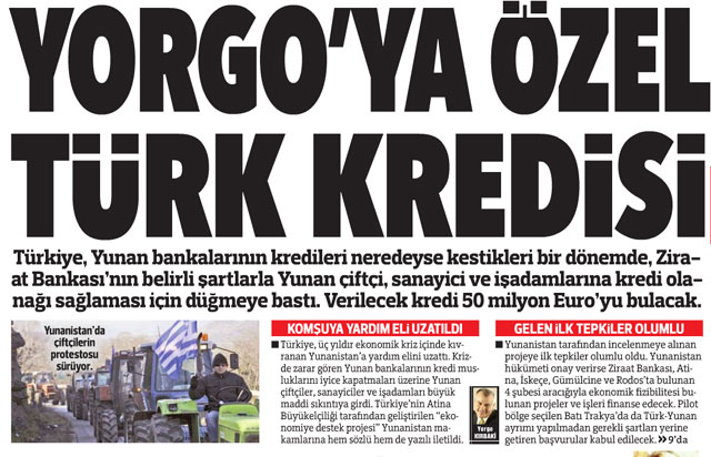 Με τίτλο «Eιδικό τουρκικό δάνειο για τον Γιώργο» η εφημερίδα δημοσιοποιεί την πρόθεση της Αγροτικής Τράπεζας της Τουρκίας (Ζiraat Bank) να δανειοδοτήσει Έλληνες αγρότες, δεδομένης της χρηματοδοτικής δυσχέρειας των ελληνικών τραπεζών. Η αναφορά του τίτλου στο όνομα « Γιώργος» δεν έχει καμία συμβολική σημασία τουλάχιστον φαινομενικά. Στην Τουρκία το ελληνικό αυτό όνομα χρησιμοποιείται ευρέως για να χαρακτηρίσει τον μέσο Έλληνα πολίτη. Προπαγάνδα.