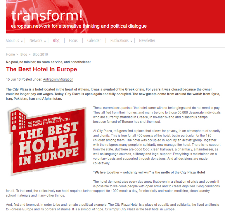 «Συμπληρώνονται σήμερα δύο μήνες από την βίαιη και παράνομη κατάληψη του κτιρίου που στέγαζε το ξενοδοχείο CITY PLAZA HOTEL. Η κατάληψη έγινε για την φιλοξενία προσφύγων. Εδώ και λίγες μέρες όμως έχει εμφανισθεί στο προσκήνιο μια γερμανική ΜΚΟ που συγκεντρώνει διεθνώς δωρεές υπό την μορφή «κρατήσεως δωματίων» (σε αλμυρές τιμές) στο CITY PLAZA για τους πρόσφυγες που φιλοξενούνται εκεί. Είναι όμως τα πράγματα τόσο «απλά» όσο φαίνονται; Με ποιο τρόπο πέρασε άραγε η διαχείριση της παράνομης κατάληψης στην γερμανική ΜΚΟ;