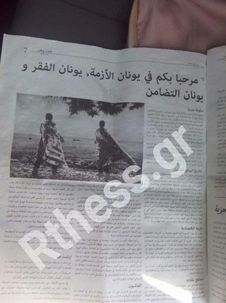 Ελληνική εφημερίδα γραμμένη στα αραβικά διανέμεται σήμερα από αγνώστους στον καταυλισμό.