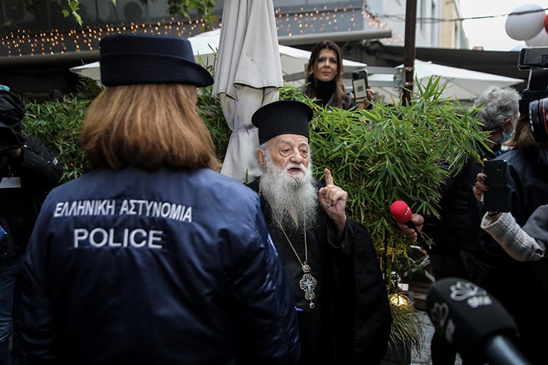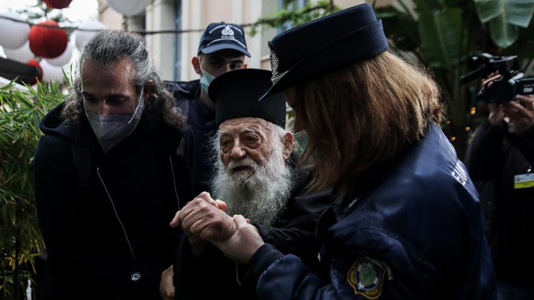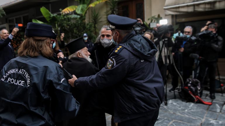 Μάλιστα σε ένα από τα βίντεο που δημοσίευσε η εφημερίδα «Καθημερινή», ο ιεράς, στην προσπάθεια των αστυνομικών να τον απομακρύνουν έπεσε πάνω σε έναν κώνο και κατέλειξε στο έδαφος.