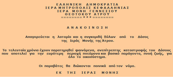 Ανακοίνωση εξέδωσε η Ιερά Μονή Άτρου Κεφαλονιάς σχετικά με τα απανωτά περιστατικά παράνομης υλοτομίας στο δάσος, πλησίον της Μονής…