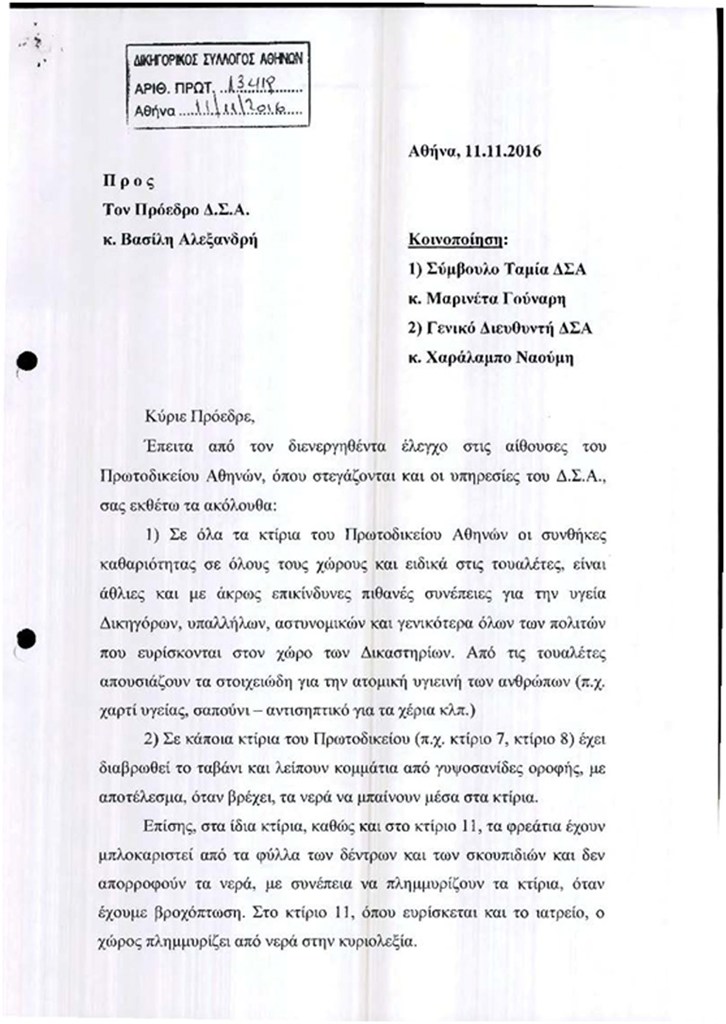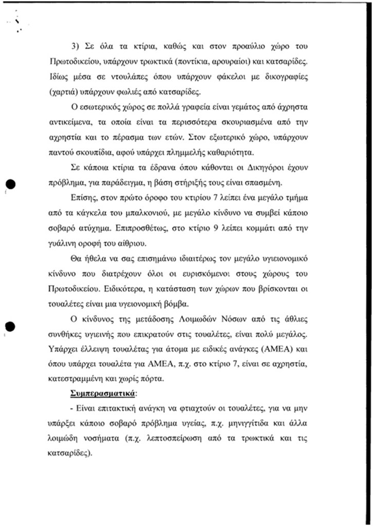 Χιλιάδες υπάλληλοι, δικαστές, δικηγόροι και πολίτες αναγκάζονται να ζουν κάτω από συνθήκες που δεν ταιριάζουν σε μία πολιτισμένη χώραΜια πραγματική υγειονομική «βόμβα» μέσα στην καρδιά της Αθήνας όπου καθημερινά βρίσκονται χιλιάδες υπάλληλοι, δικαστές, δικηγόροι και πολίτες οι οποίοι αναγκάζονται να ζουν κάτω από συνθήκες που δεν ταιριάζουν σε μία πολιτισμένη χώρα. Πόσω μάλλον δε που η Δικαιοσύνη και η ταχεία αλλά και αποτελεσματική της απονομή αποτελούν μνημονιακή υποχρέωση αλλά και κορυφαίο στοίχημα για την κυβέρνηση.