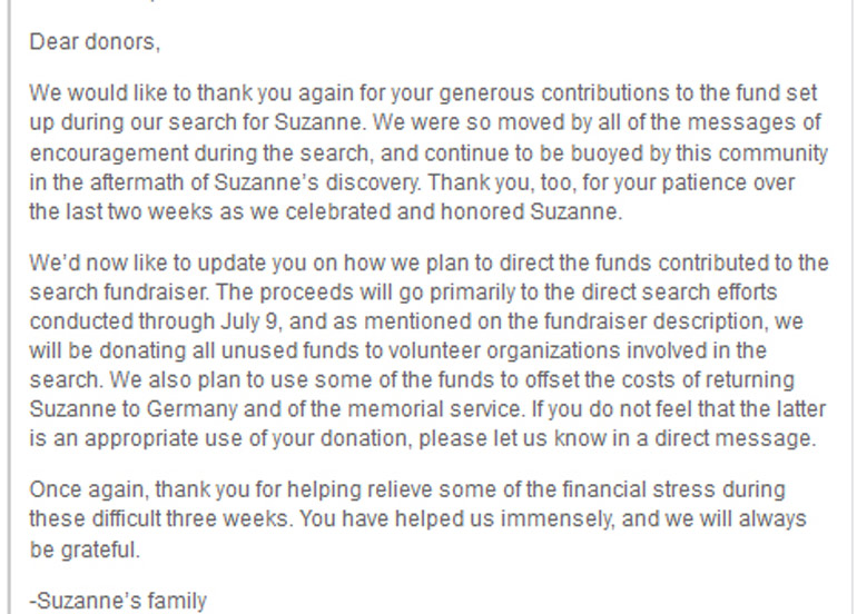 «Θα θέλαμε να σας ευχαριστήσουμε και πάλι για τις γενναιόδωρες συνεισφορές σας στο ταμείο που ορίστηκε κατά τη διάρκεια της έρευνας μας για τη Σουζάν. Σας ευχαριστούμε, επίσης, για την υπομονή σας τις τελευταίες δύο εβδομάδες.