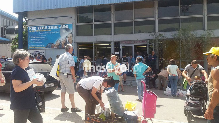 Ένταση επικράτησε το μεσημέρι στο Περίπτερο 16 της ΔΕΘ, με τον κόσμο να σχηματίζει ουρές για την τρίτη διανομή τροφίμων, φρούτων – λαχανικών, ελαιολάδου, κοτόπουλου, τυριού και ειδών βασικής υλικής συνδρομής (απορρυπαντικά ρούχων και πιάτων).