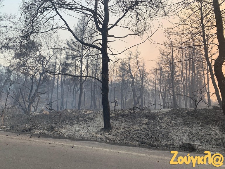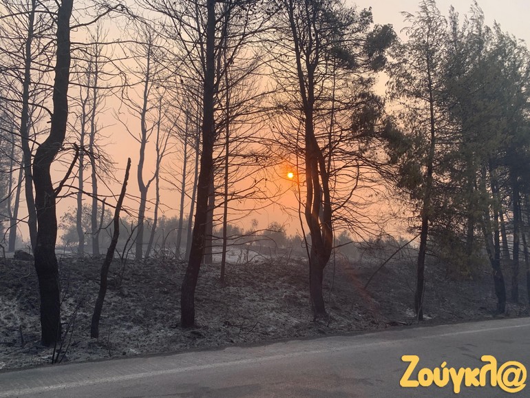 Σήμερα στην άλλοτε καταπράσινη περιοχή της Αγίας Άννας με τα φαράγγια και τα πυκνά δάση της, μυρίζει καμένο αφού τα πάντα έγιναν στάχτη… Ο ανατέλλων ήλιος φωτίζει τα καμένα δέντρα, αναδεικνύοντας στο μέγιστο την περιβαλλοντική καταστροφή!