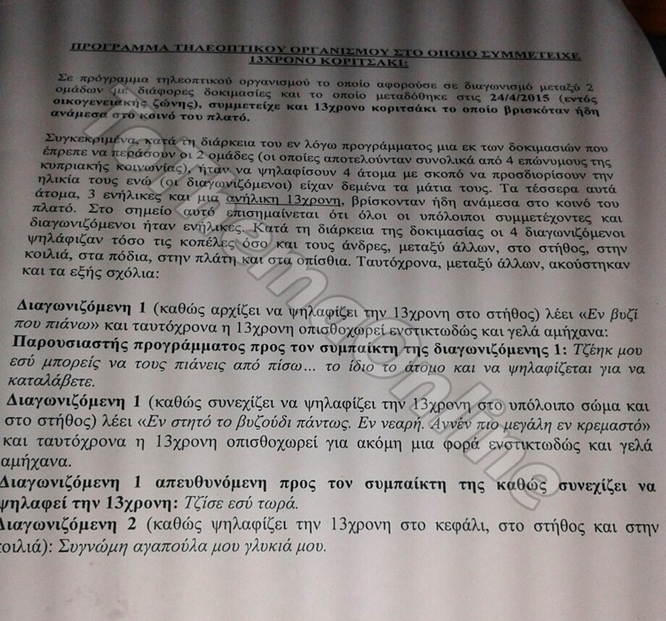 Απαράδεκτες σκηνές διαδραματίστηκαν σε τηλεπαιχνίδι κυπριακού καναλιού, όταν μία διαγωνιζόμενη, η οποία είχε κλειστά τα μάτια της με μαντήλι, «ψηλάφισε» 13χρονο κορίτσι στο στήθος, κάνοντας παράλληλα απρεπή σχόλια, χωρίς να γνωρίζει ότι απέναντί της βρισκόταν ανήλικη.