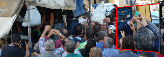 Η κατάσταση κάποια στιγμή ξέφυγε από κάθε έλεγχο, όταν οι παραγωγοί αναγκάστηκαν να βάλουν μπροστά τα φορτηγά για να τα… φυγαδέψουν από τους μαινόμενους πολίτες.