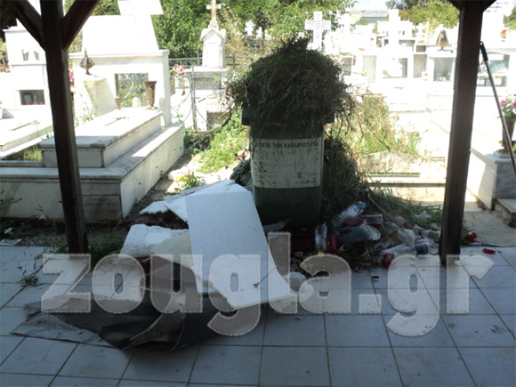 Διασκορπισμένα σκουπίδια, καταστραμμένοι κάδοι απορριμμάτων αντικρίζει κάποιος που επισκέπτεται το νεκροταφείο.