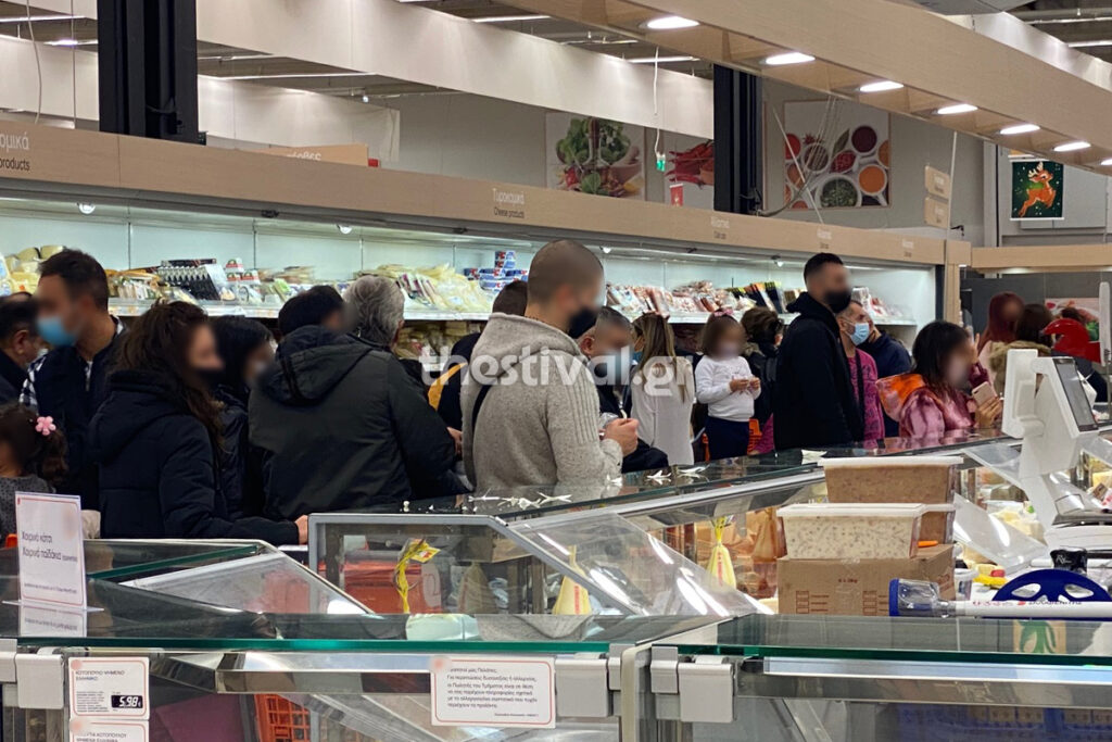 Όπως είναι λογικό ο κόσμος συνωστίζεται μπροστά από τα ψυγεία πώλησης τυροκομικών και αλλαντικών, στα ζαρζαβατικά και στο κρεοπωλείο. Όλοι φορούν μάσκες, όμως είναι πρακτικά αδύνατο να τηρηθούν αποστάσεις.