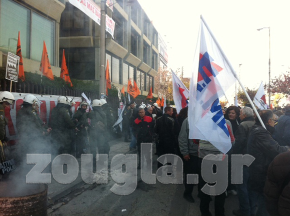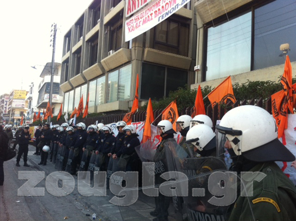 Οι συνδικαλιστές σχημάτισαν αλυσίδα μπροστά στην είσοδο του κτηρίου, προκειμένου να μην μπορέσουν να τους διασπάσουν οι αστυνομικές δυνάμεις που έχουν παραταχθεί στο σημείο.