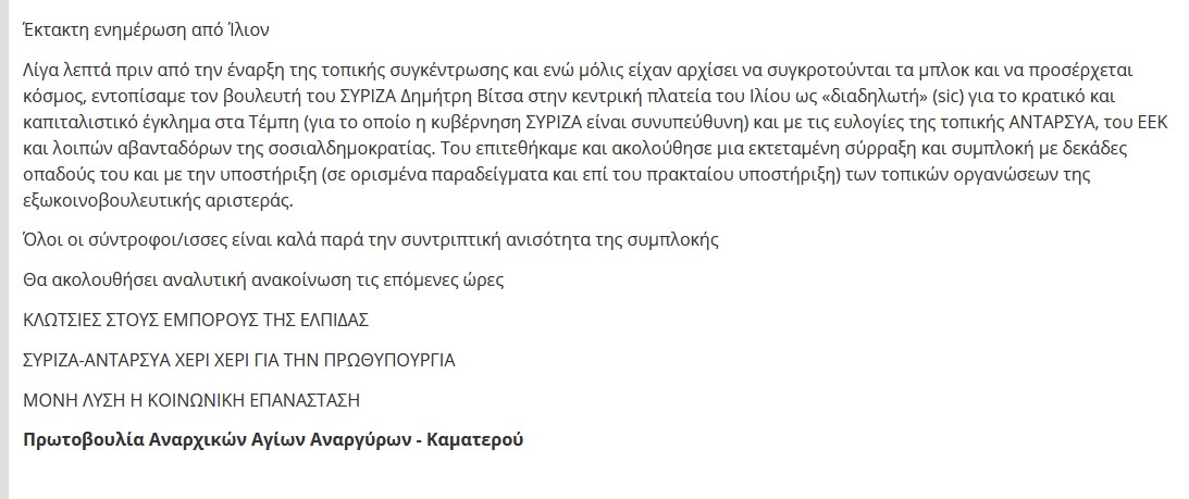 «Λίγα λεπτά πριν από την έναρξη της τοπικής συγκέντρωσης και ενώ μόλις είχαν αρχίσει να συγκροτούνται τα μπλοκ και να προσέρχεται κόσμος, εντοπίσαμε τον βουλευτή του ΣΥΡΙΖΑ Δημήτρη Βίτσα στην κεντρική πλατεία του Ιλίου ως “διαδηλωτή” (sic) για το κρατικό και καπιταλιστικό έγκλημα στα Τέμπη (για το οποίο η κυβέρνηση ΣΥΡΙΖΑ είναι συνυπεύθυνη) και με τις ευλογίες της τοπικής ΑΝΤΑΡΣΥΑ, του ΕΕΚ και λοιπών αβανταδόρων της σοσιαλδημοκρατίας. Του επιτεθήκαμε και ακολούθησε μια εκτεταμένη σύρραξη και συμπλοκή με δεκάδες οπαδούς του και με την υποστήριξη (σε ορισμένα παραδείγματα και επί του πρακταίου υποστήριξη) των τοπικών οργανώσεων της εξωκοινοβουλευτικής αριστεράς».