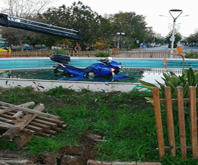 Η μηχανή του χτύπησε στο κράσπεδο, έσπασε τον ξύλινο φράχτη για να καταλήξει μέσα στο σιντριβάνι. Ο αναβάτης είχε μικρές εκδορές καθώς φορούσε κράνος.