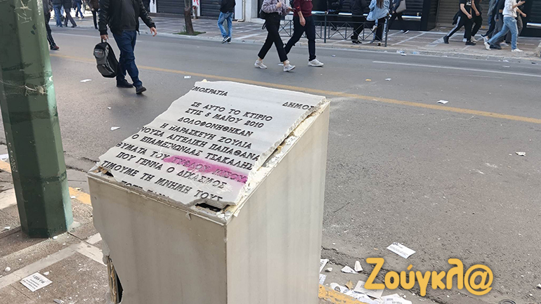 Κατά τη διάρκεια της πορείας, ομάδα αγνώστων έσπασε το μνημείο για τα θύματα της Marfin:
