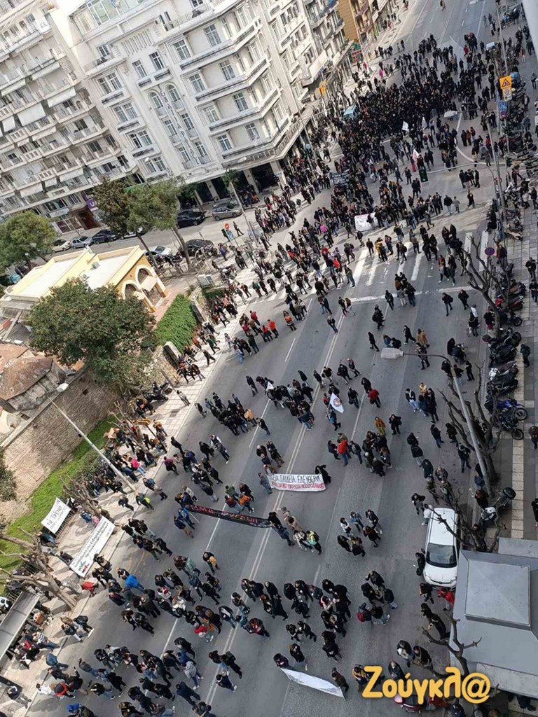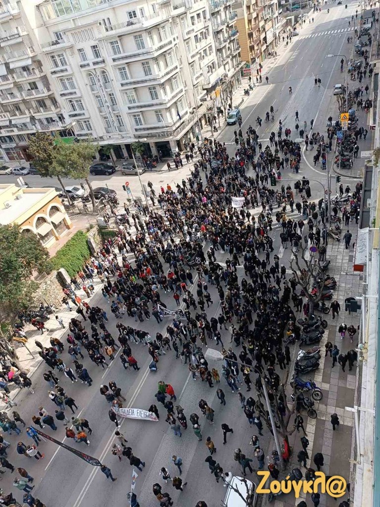 Πορεία διαμαρτυρίας έγινε στο κέντρο της Θεσσαλονίκης νωρίτερα για την τραγωδία στα Τέμπη, που στοίχισε τη ζωή σε 57 επιβάτες.