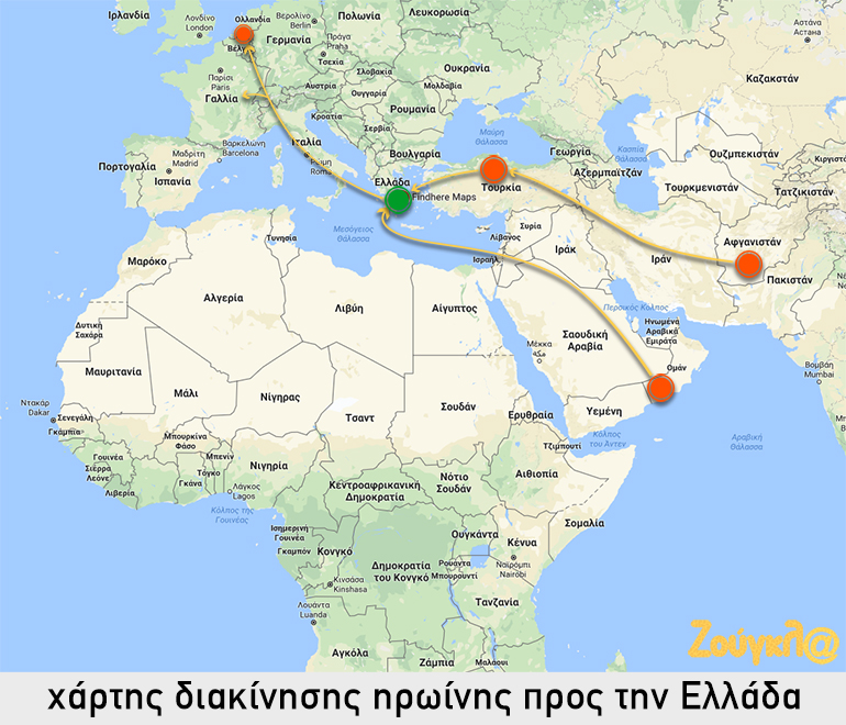 Οι μεγαλύτερες ποσότητες ηρωίνης παγκοσμίως μεταφέρονται και διακινούνται από τα χερσαία εδάφη,ξεκινώντας από τις χώρες παραγωγής (Αφγανιστάν, Τατζικιστάν, Πακιστάν κ.λπ.), περνώντας μέσα από την Τουρκία και ακολουθώντας στη συνέχεια τρεις εναλλακτικές διαδρομές, με προορισμό της χώρες της Δυτικής Ευρώπης. Εξ αυτών, η νοτιότερη διαδρομή, παρά τις συνεχείς τροποποιήσεις της, έχει ως βασική κατεύθυνση την Ιταλία, είτε απευθείας μέσω Ελλάδας, είτε μέσω Βουλγαρίας, Π.Γ.Δ.Μ., Αλβανίας, και Ελλάδας.