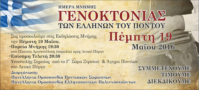 Στην πλατεία Αριστοτέλους, στις 19.30, δίνουν ραντεβού η Πανελλήνια Ομοσπονδία Ποντιακών Σωματείων και η Πανελλήνια Ομοσπονδία Ελληνοποντίων Παλιννοστούντων. Με σύνθημα «συμμετέχουμε, τιμούμε, διεκδικούμε», οι δύο ομοσπονδίες συνδιοργανώνουν πορεία από την πλατεία Αριστοτέλους προς τον Λευκό Πύργο, όπου στις 20.30 θα πραγματοποιηθεί η επίσημη τελετή που θα περιλαμβάνει την υποστολή σημαίας από το Γ΄ Σώμα Στρατού και άγημα Ποντίων.