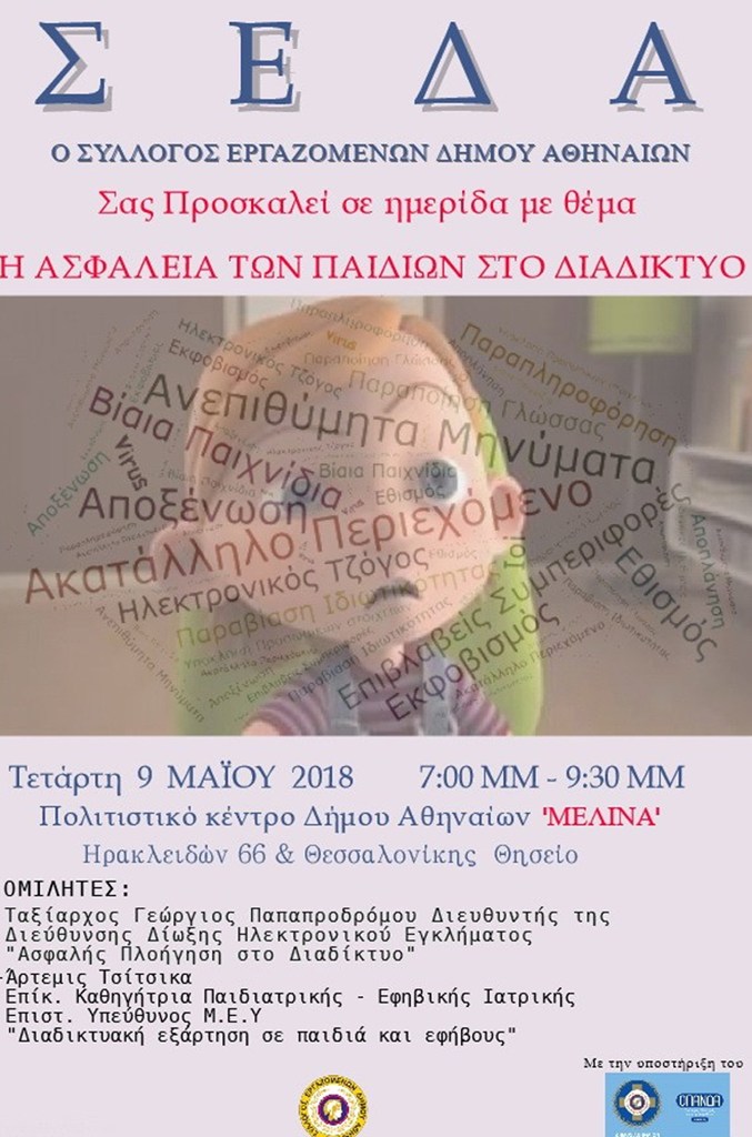 Ο Σύλλογος Εργαζομένων Δήμου Αθηναίων (Σ.Ε.Δ.Α.) πραγματοποιεί Ημερίδα με θέμα: «Η Ασφάλεια Των Παιδιών στο Διαδίκτυο», την Τετάρτη 9-5-2018, από 19:00-21:30, στο Πολιτιστικό Κέντρο του Δήμου Αθηναίων ‘Μελίνα’, Ηρακλειδών 66 και Θεσσαλονίκης, Γέφυρα Πουλόπουλου.